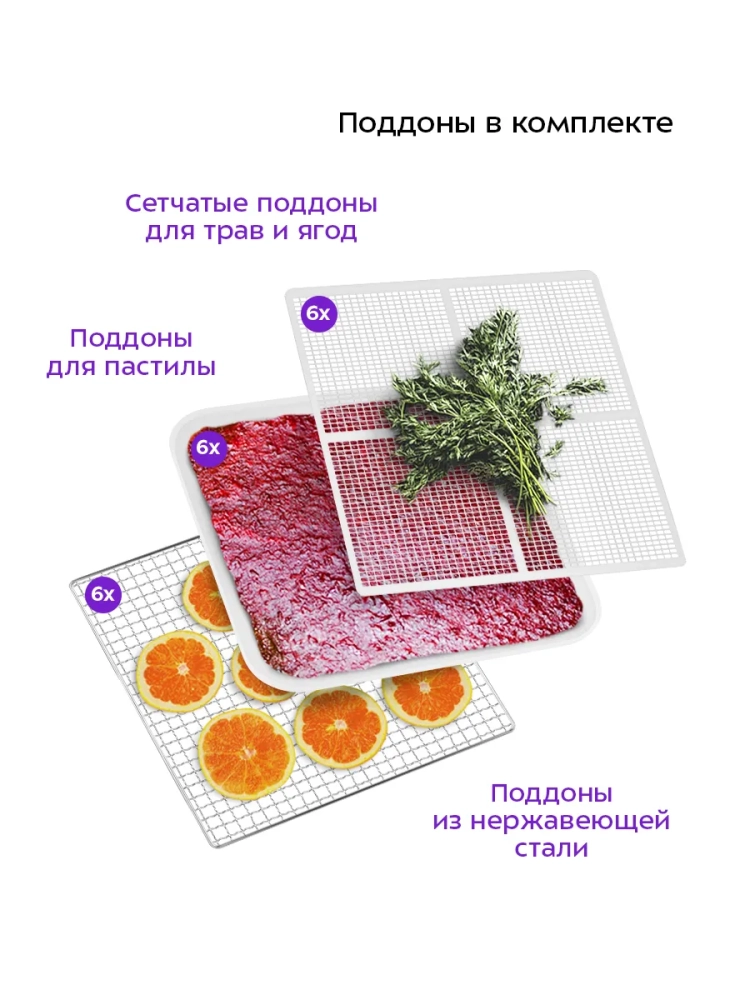В комплект сушилки входят 6 поддонов из нержавеющей стали, 6 сеток и 6 поддонов для пастилы.