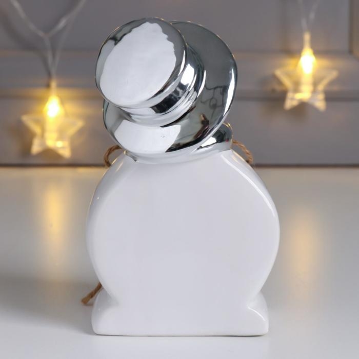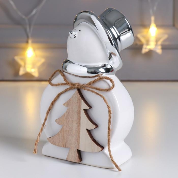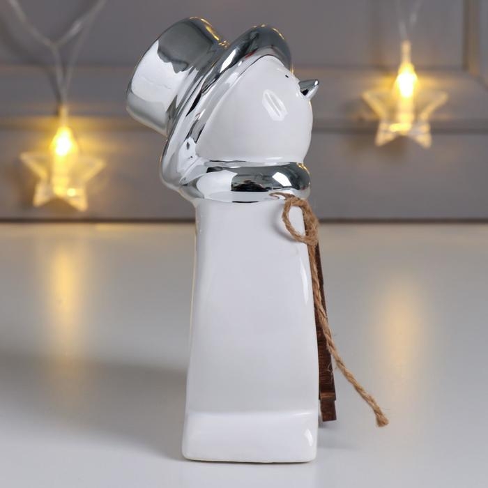 Сувенир керамика, дерево "Снеговик в цилиндре, с ёлочкой" серебро 14,7х6,5х9 см