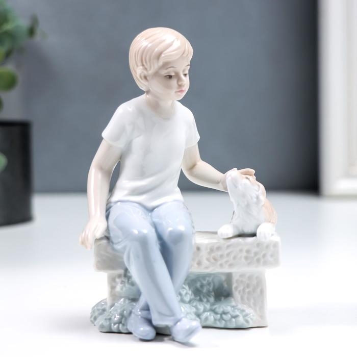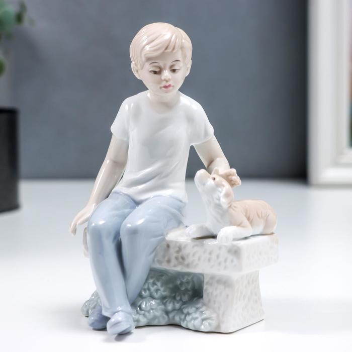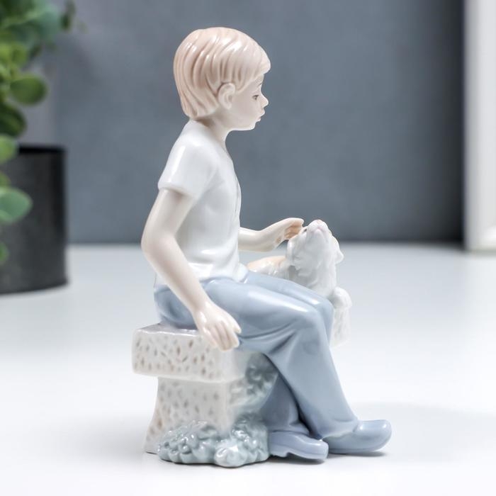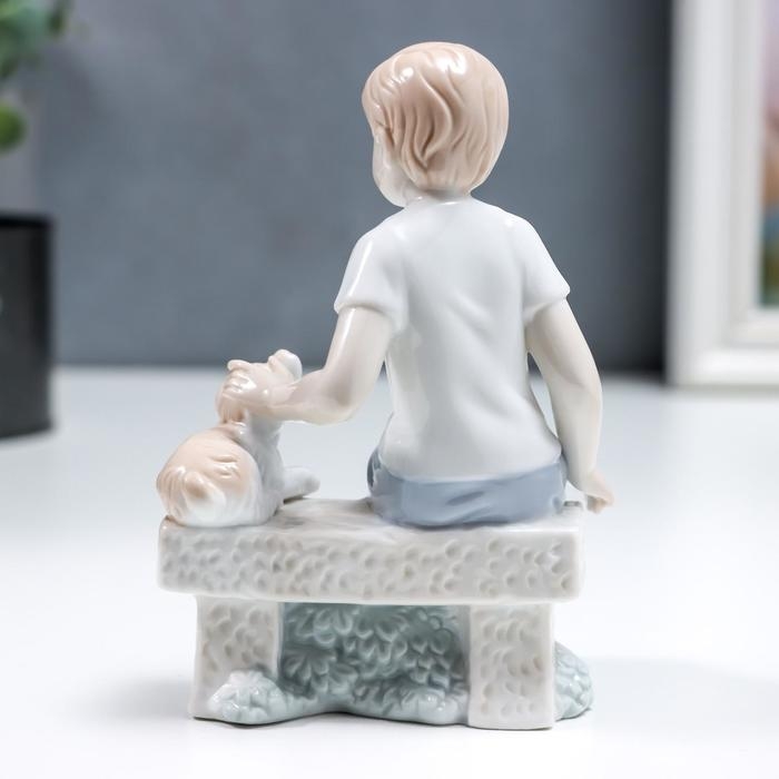 Сувенир керамика "Мальчик на скамеечке с пёсиком" 14 см