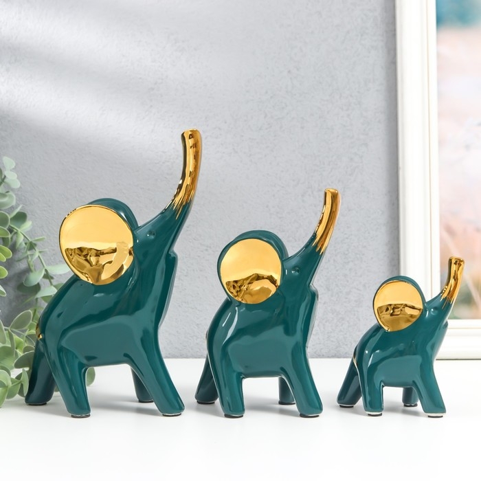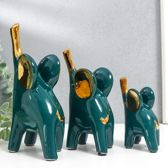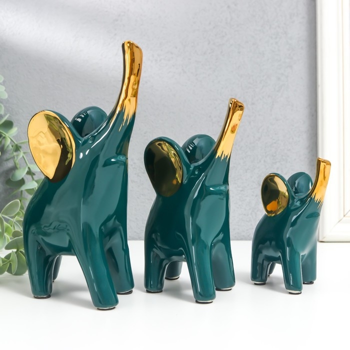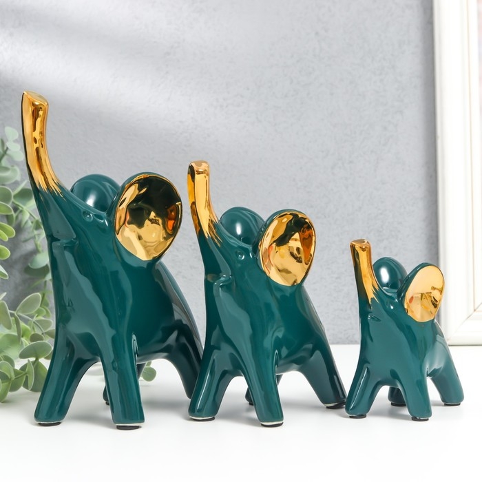 Сувенир керамика "Слоники - зелёный глянец" золото набор 3 шт 9х11; 10,5х15,5; 12,5х19 см