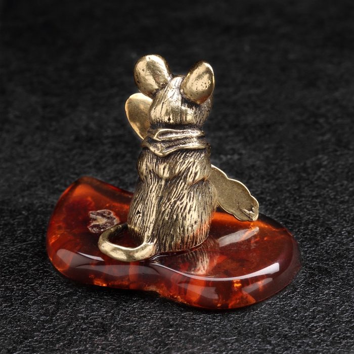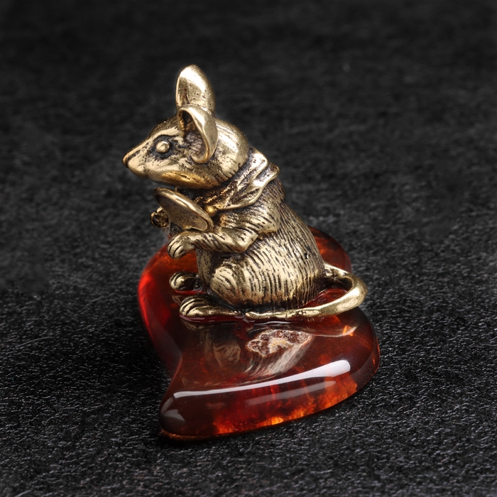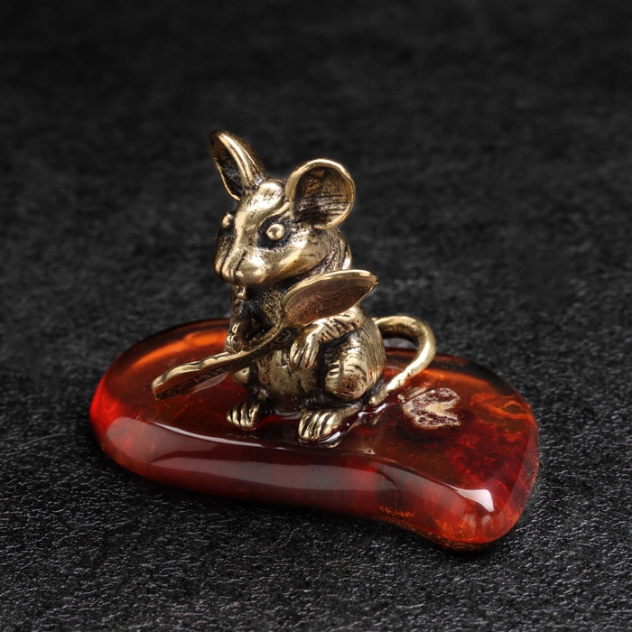 Сувенир "Мышка с ложкой загребушкой", латунь, янтарь