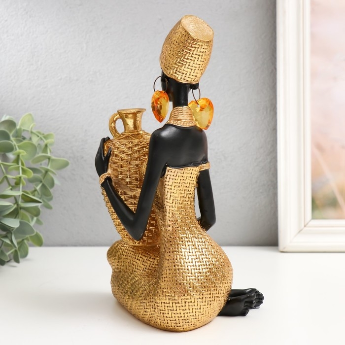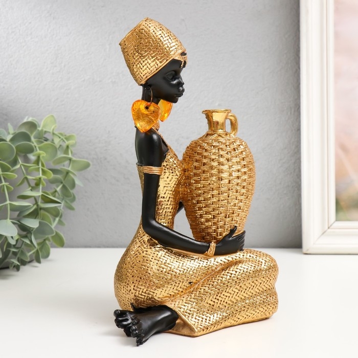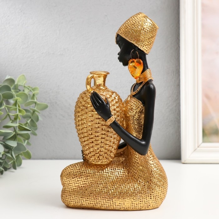 Сувенир полистоун "Африканка сидит с плетёным кувшином" золото 23х13,5х10,3 см