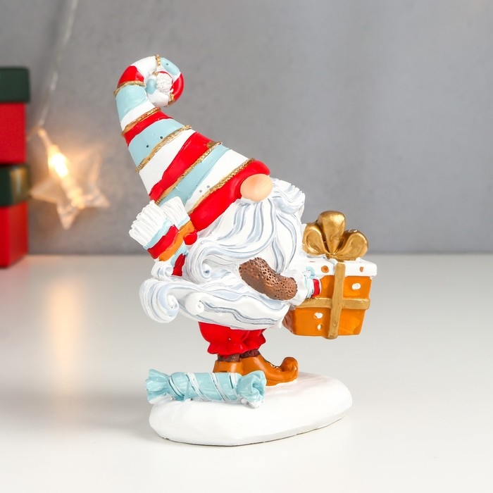 Сувенир полистоун "Дедушка Мороз с подарком, в полосатом колпаке" 13х5,5х10,5 см