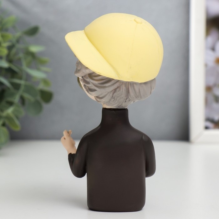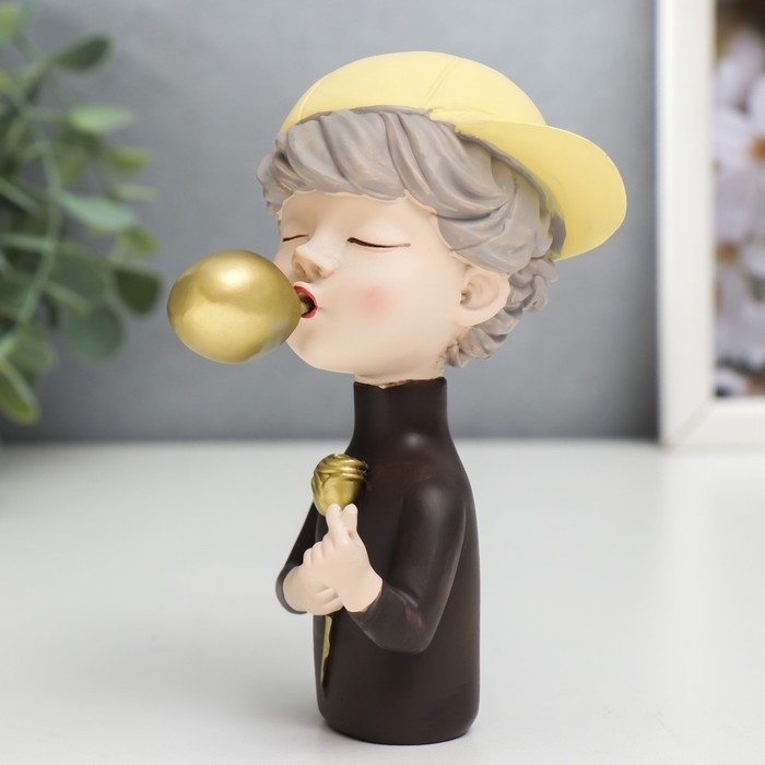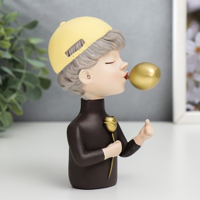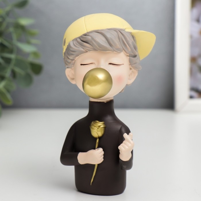 Сувенир полистоун "Мальчишка в золотой бейсболке с розой и золотым пузырём" 12х6х8 см