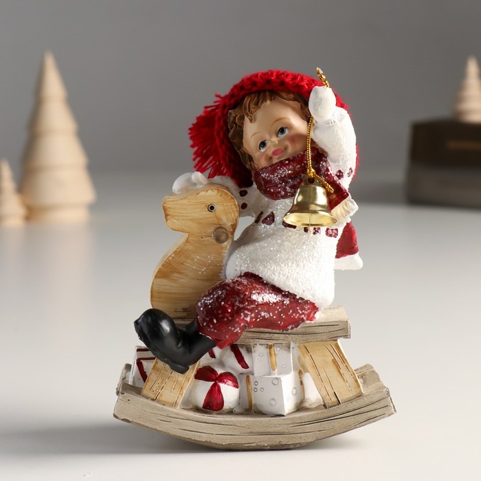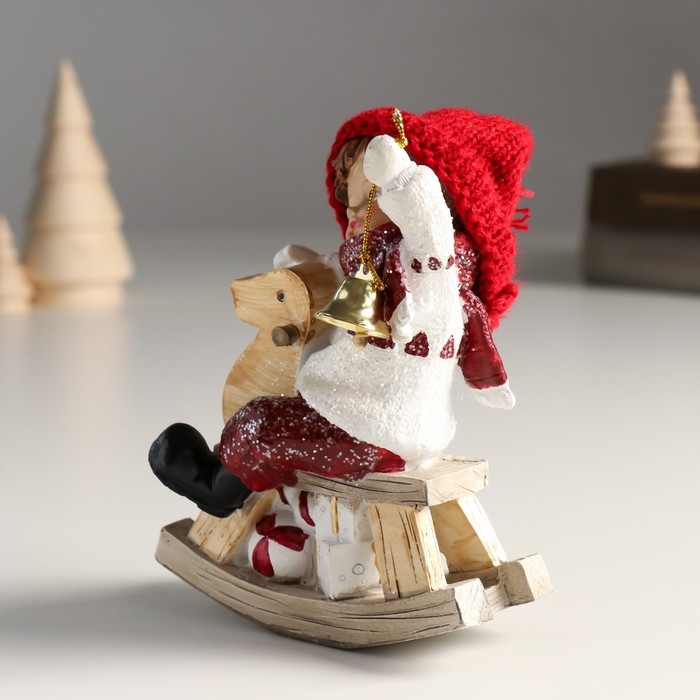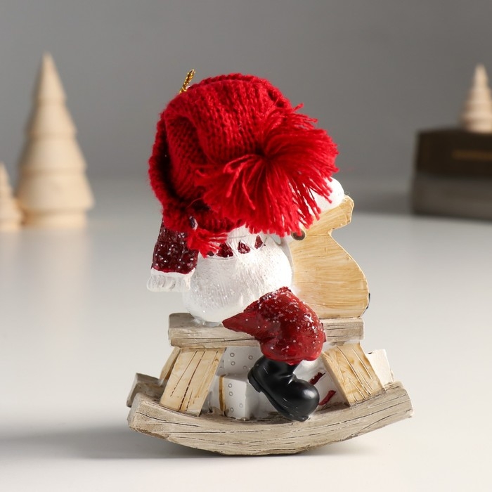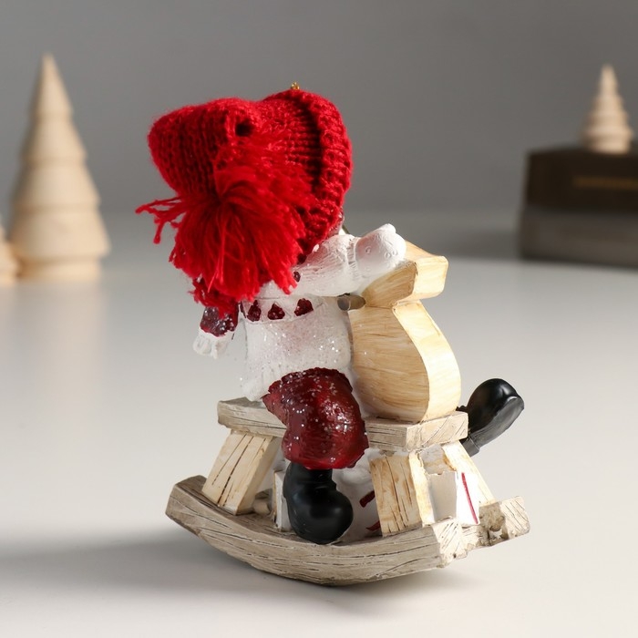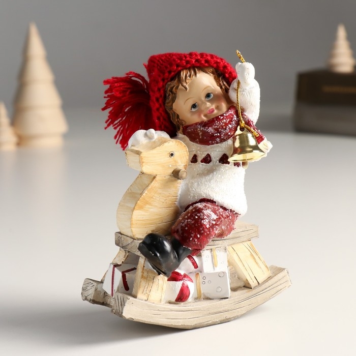 Сувенир полистоун "Малыш в большой красной шапке на игрушке-качалке" 6х10х13 см