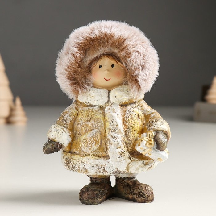 Сувенир полистоун "Малыш в шубе с меховым капюшоном, с подарком/фонарем" МИКС 6,5х9,5х13 см 949889