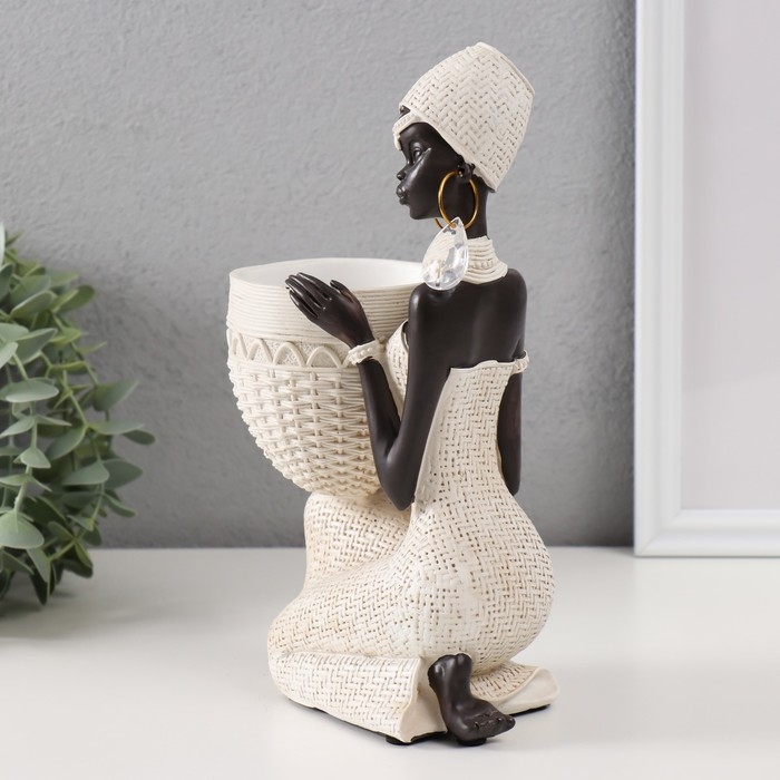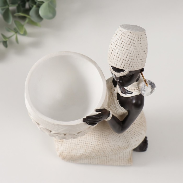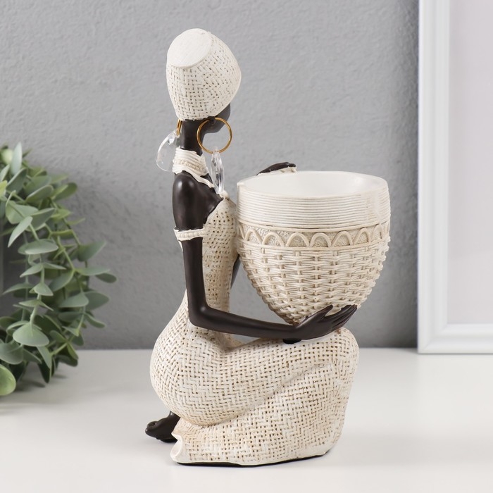 Сувенир полистоун подставка "Африканка сидит, с плетёным кашпо" белый 14х9х24 см