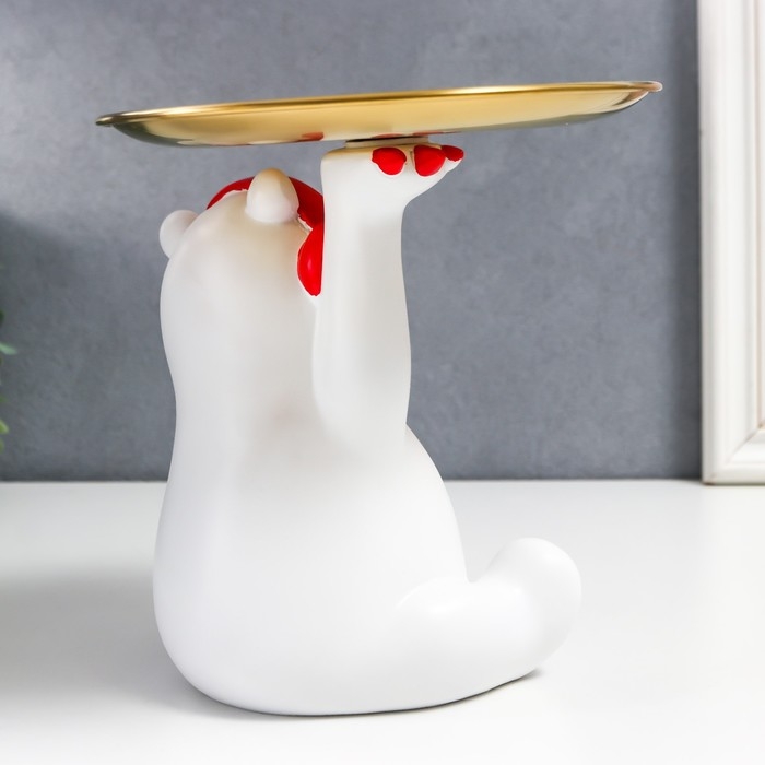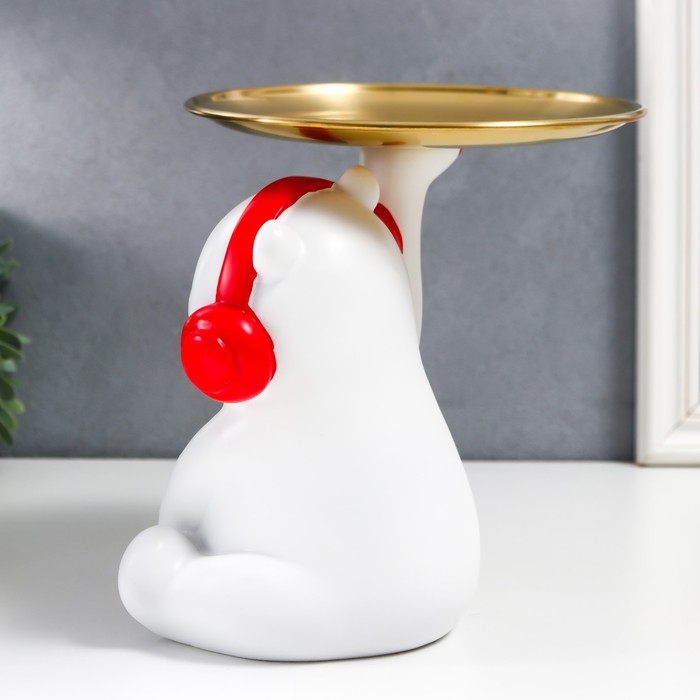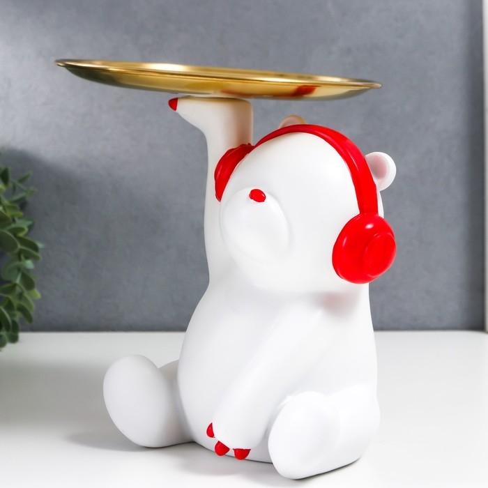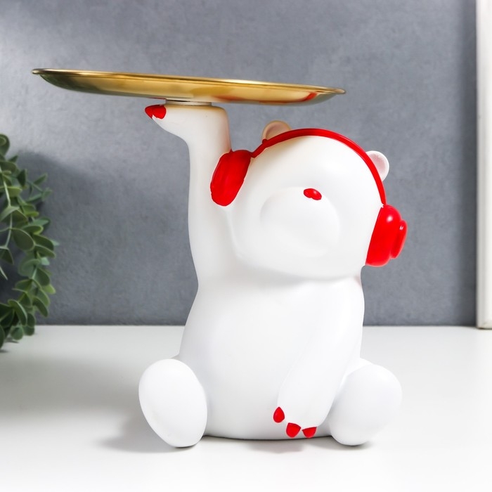 Сувенир полистоун подставка "Белый медвежонок в красных наушниках" d=17 см 18х12х15,5 см
