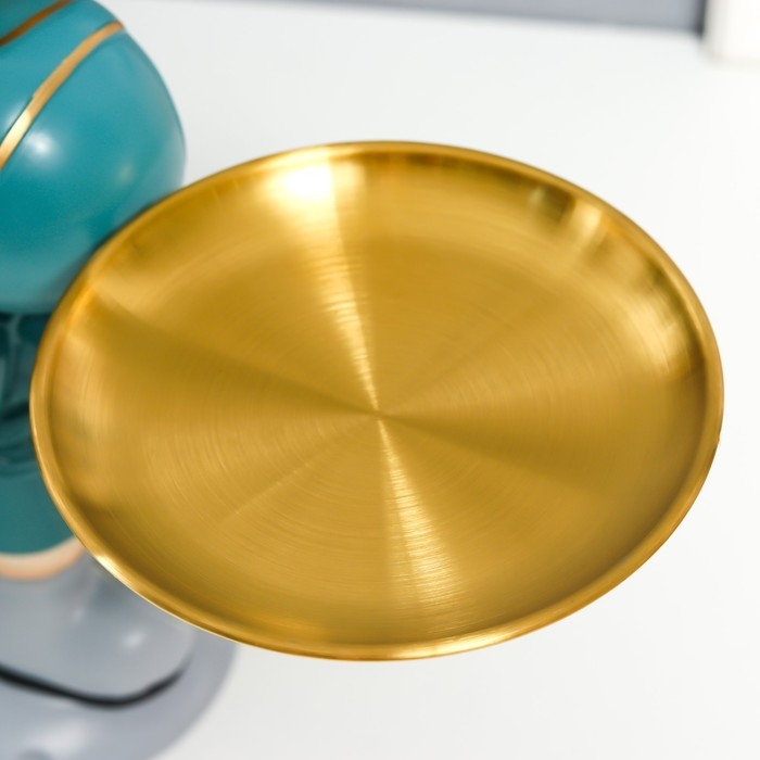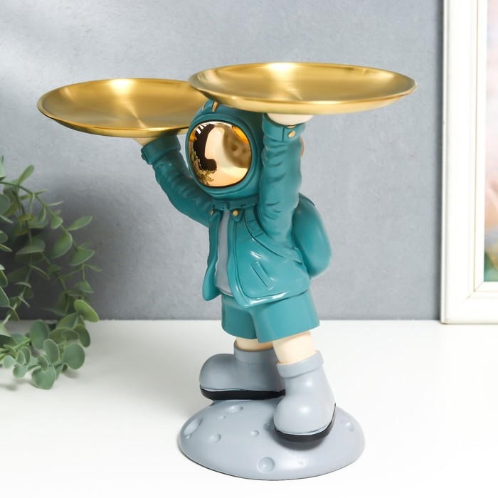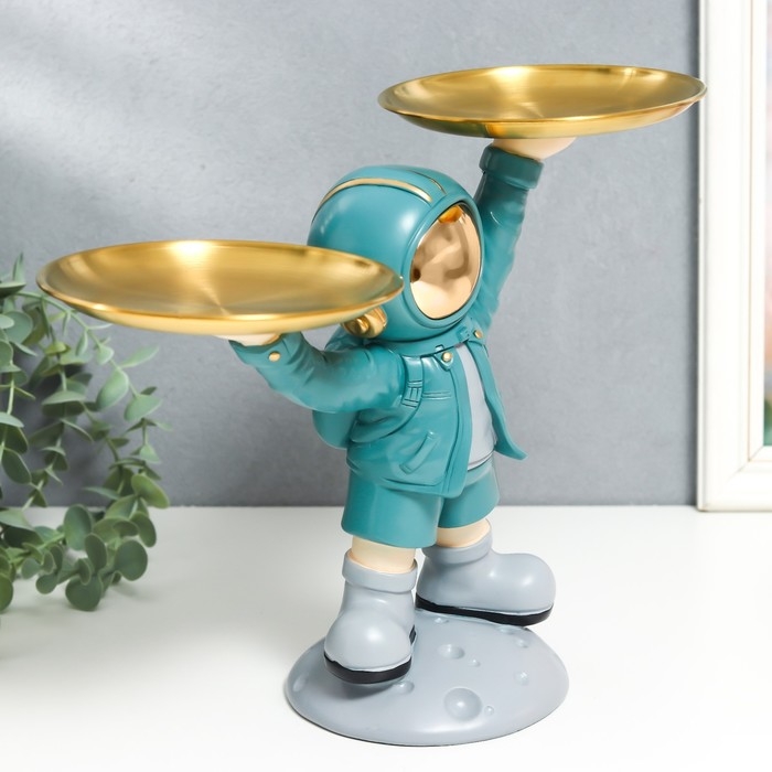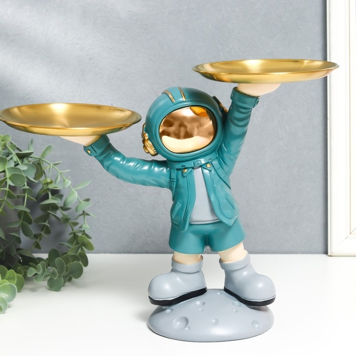 Сувенир полистоун подставка "Космонавт в бирюзовом с двумя блюдами" 14х26,5х32 см