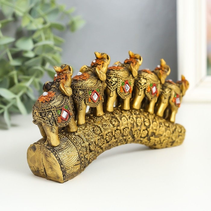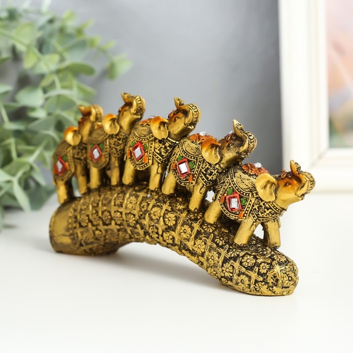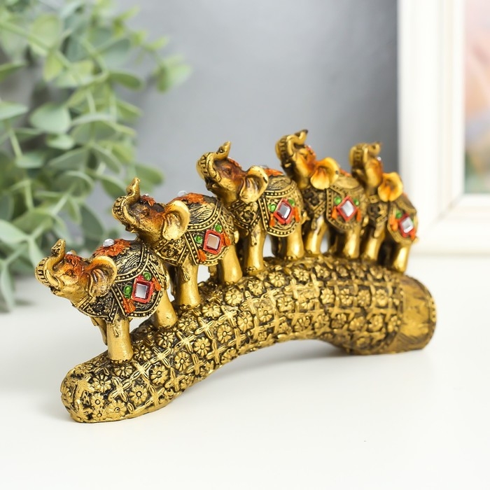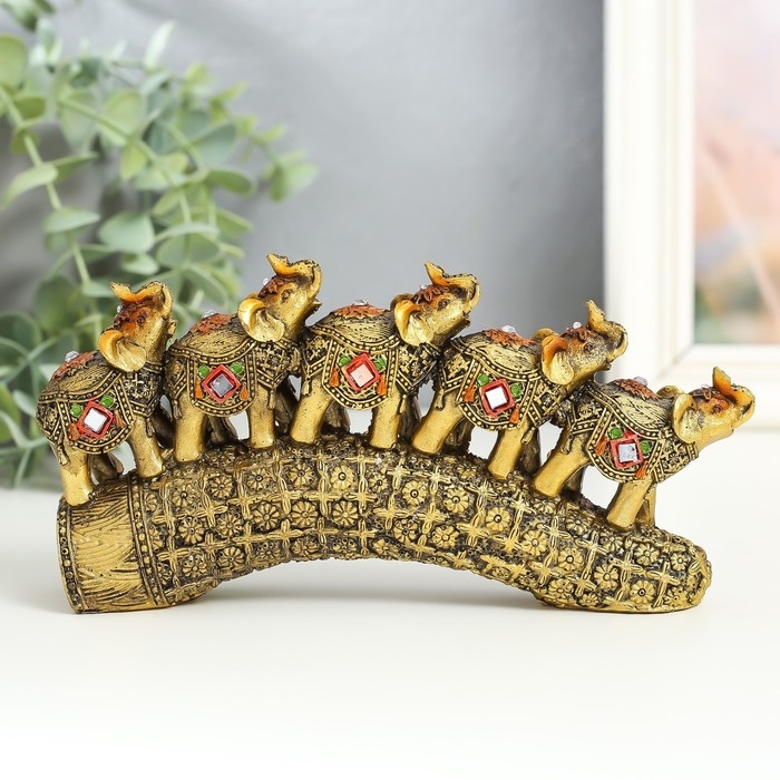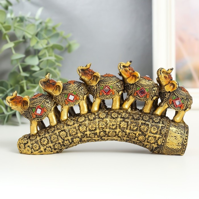 Сувенир полистоун "Пять слонов на бивне с цветами" бронза 17х4х8 см