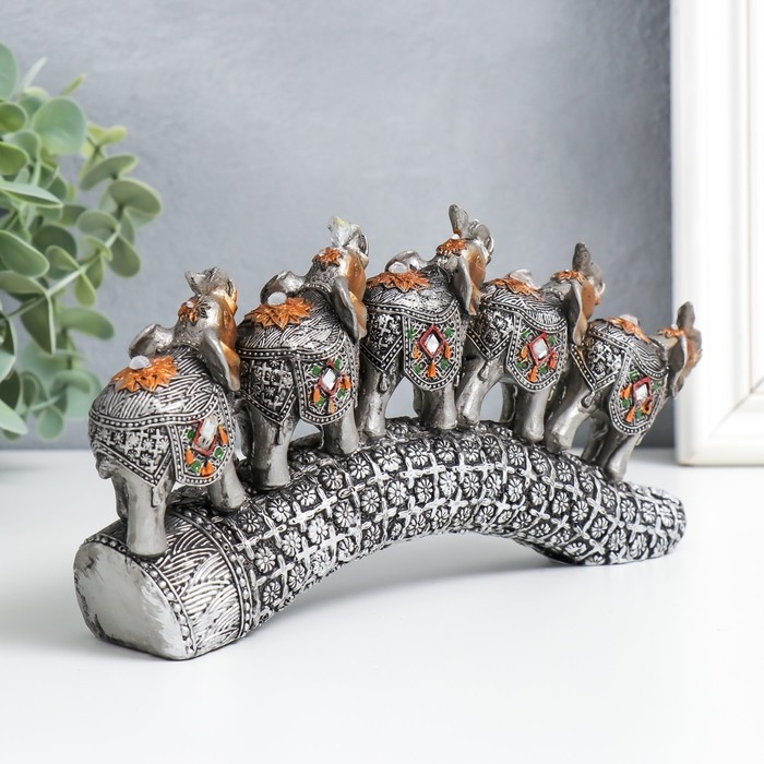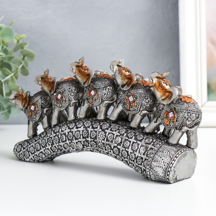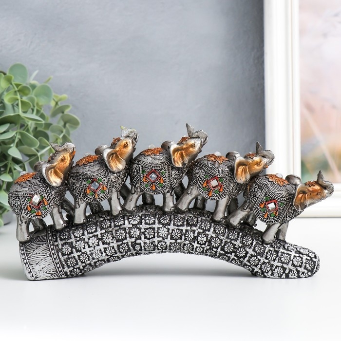 Сувенир полистоун "Пять слонов на бивне с цветами" серебро 20,5х4х11 см