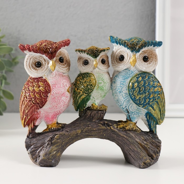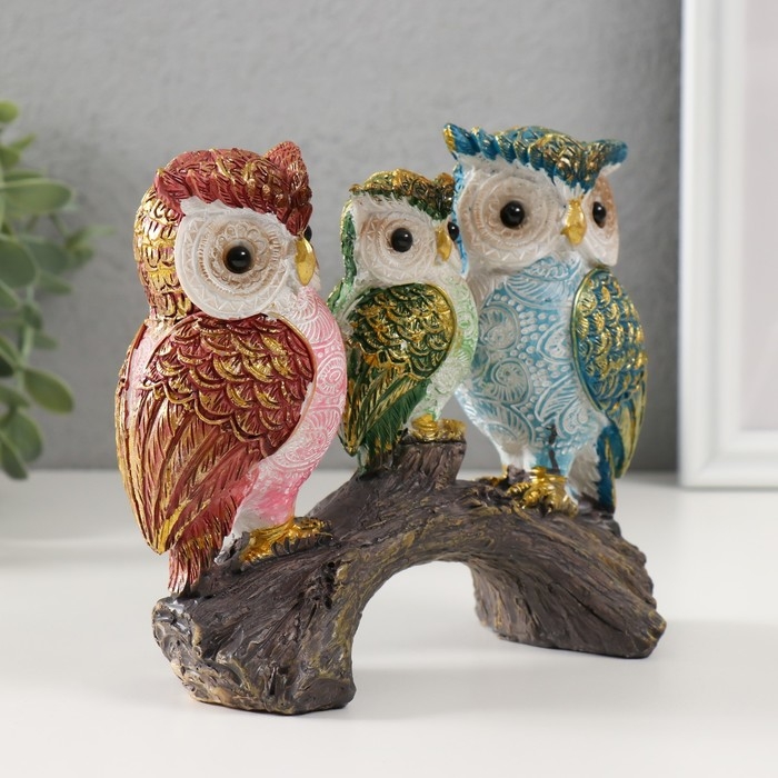 Сувенир полистоун "Семья цветных филинов на ветке" 6х14,5х13 см