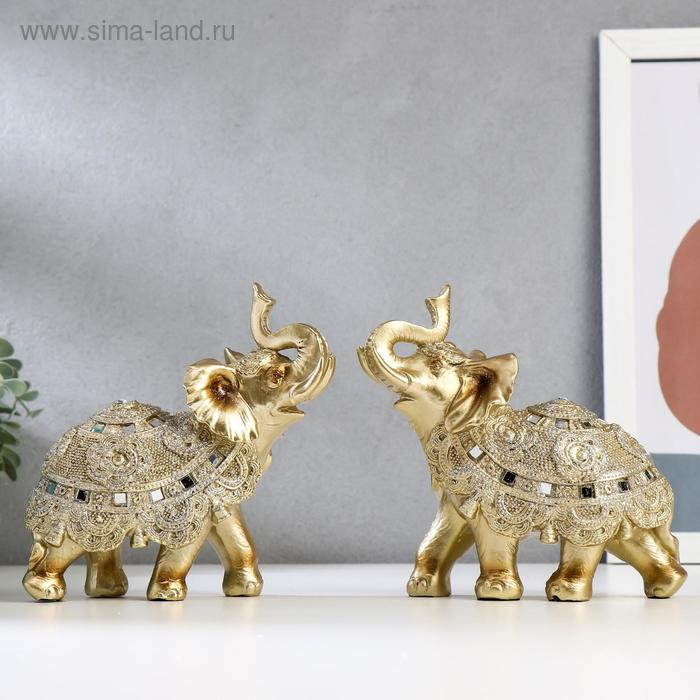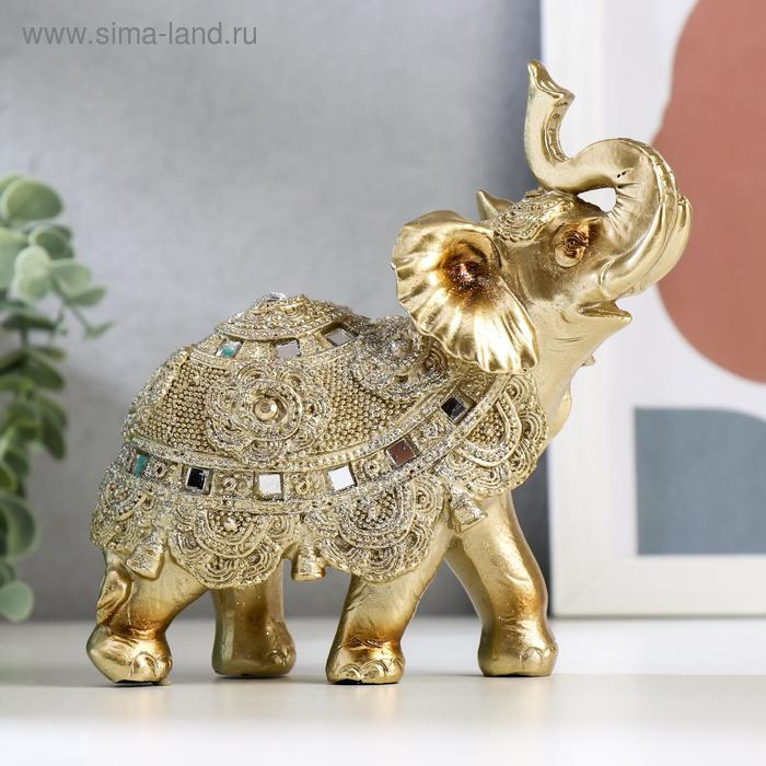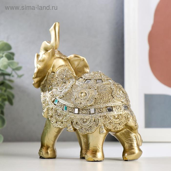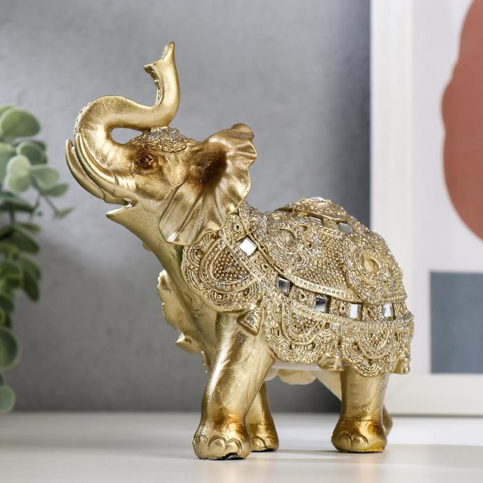 Сувенир полистоун "Золотой слон с попоной из бисера с колокольчиками"МИКС 15х14,5х7,7 см