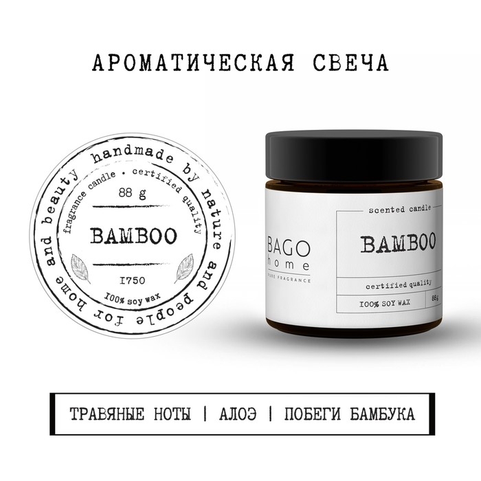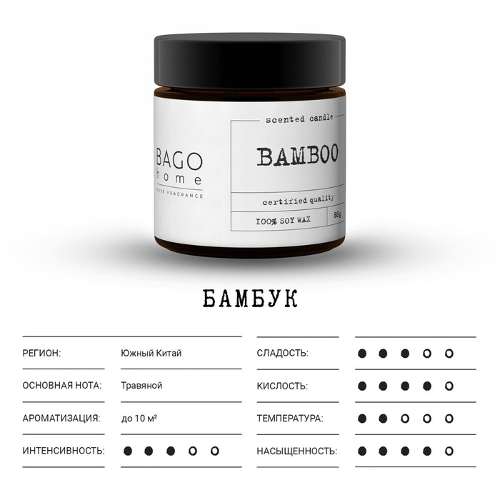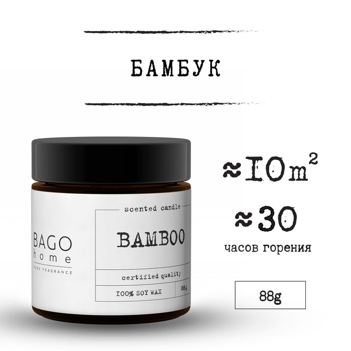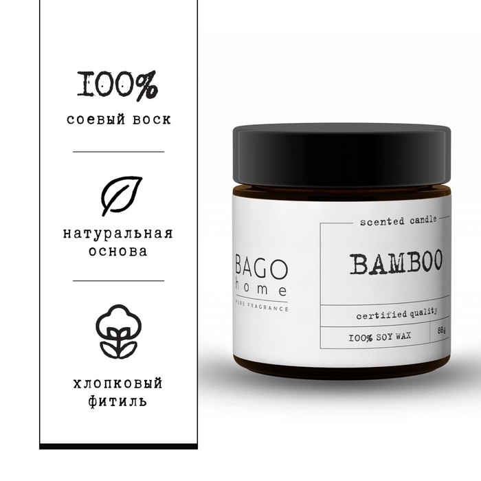 Ароматические свечи BAGO home изготавливаются из 100% органического и биоразлагаемого соевого воска, который не выделяет вредных веществ при горении. Соевый воск - это биологически и экологически чистый продукт, не содержащий продуктов нефтепереработки, свечи из соевого воска абсолютно безопасны, при горении такие свечи не повышают уровень CO2 в воздухе.