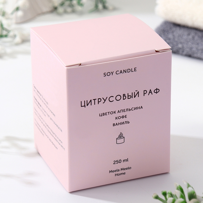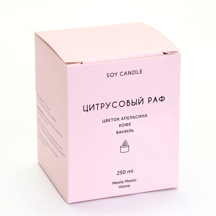 Ароматическая свеча «ЦИТРУСОВЫЙ РАФ» обладает кофейно-фруктовым ароматом, который создаёт атмосферу комфорта и уюта в спальне, гостиной, на кухне и в других комнатах.