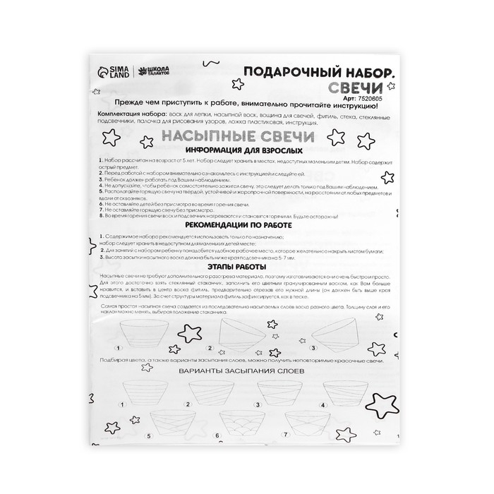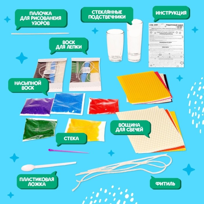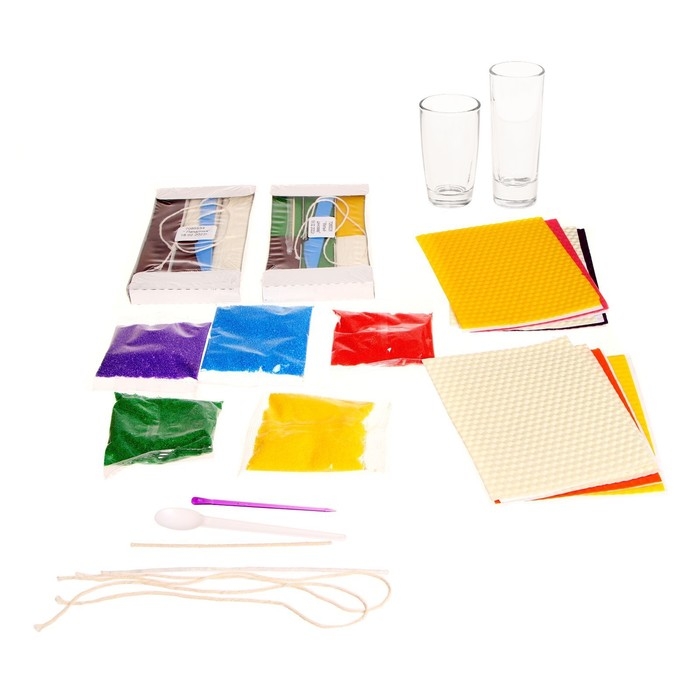С набором для творчества ребёнок сделает уникальные свечи своими руками. Всего у малыша получится 3 вида изделий в разной технике.