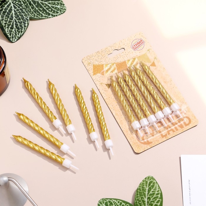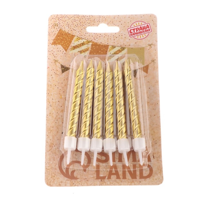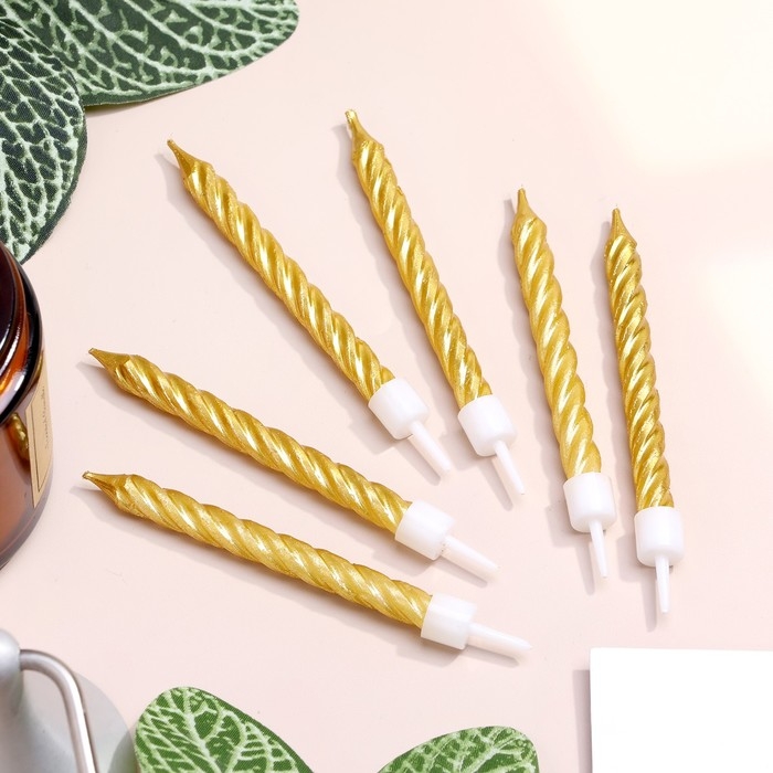 Свечи в торт с подставками, золотые, средние, набор 6 шт, 8 см