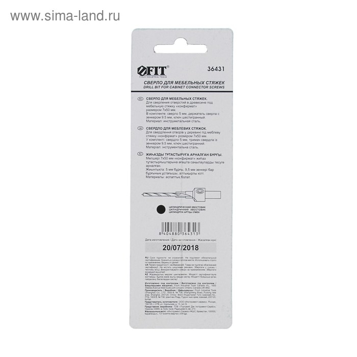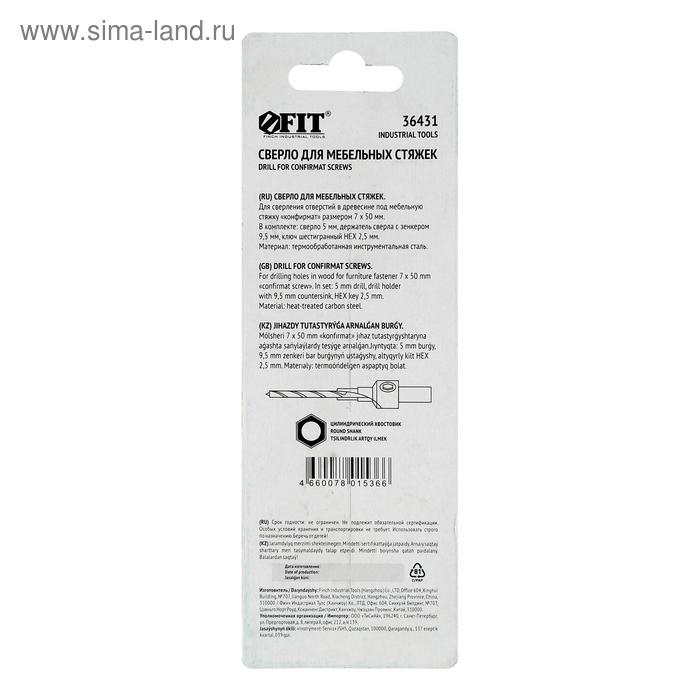 Сверло под конфирмат FIT 36431, для мебельных стяжек, 5 мм/зенкер 9.5 мм, для стяжки 7х50