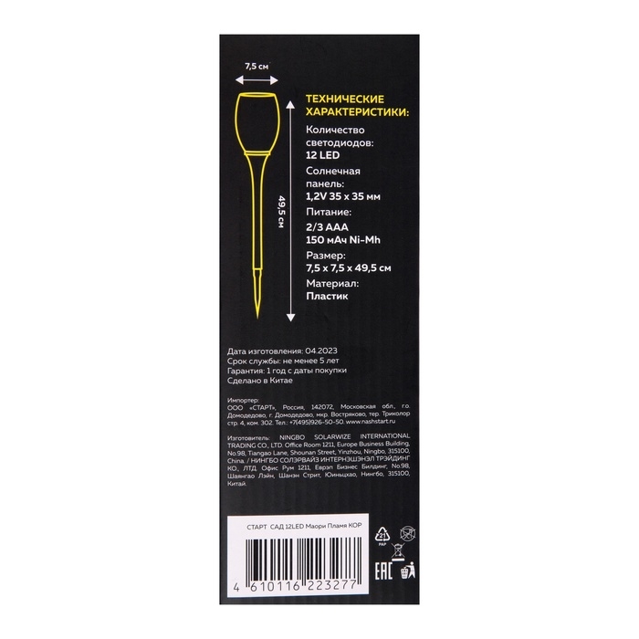 Светильник на солнечной бат. "СТАРТ", "Маори" 7.5x49.5 см, IP44, 12 LED, эфф. огня, Т/БЕЛЫЙ