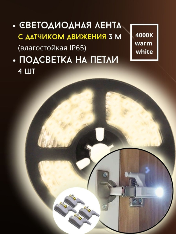 ТЕПЛЫЙ СВЕТ + петли НАБОР: Влагостойкая светодиодная лента с датчиком движения с USB зарядкой 3 метра (1 ШТ) / Подсветка на мебельную петлю (4 ШТ); Светодиодная лента с датчиком движения 3 метра