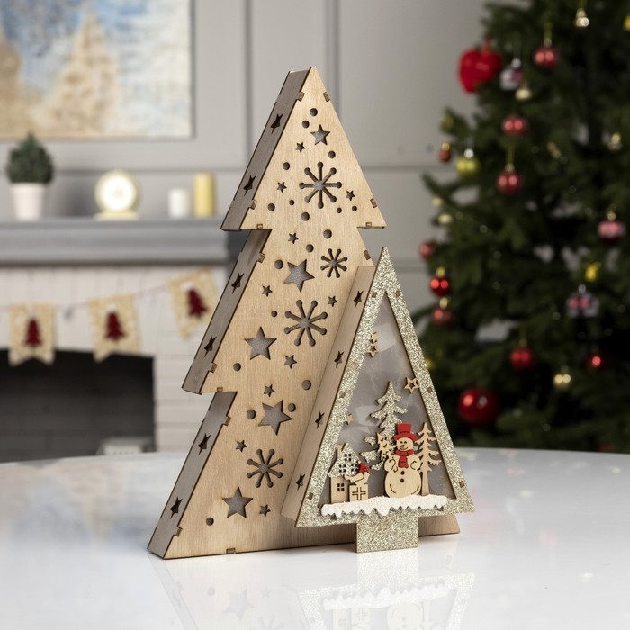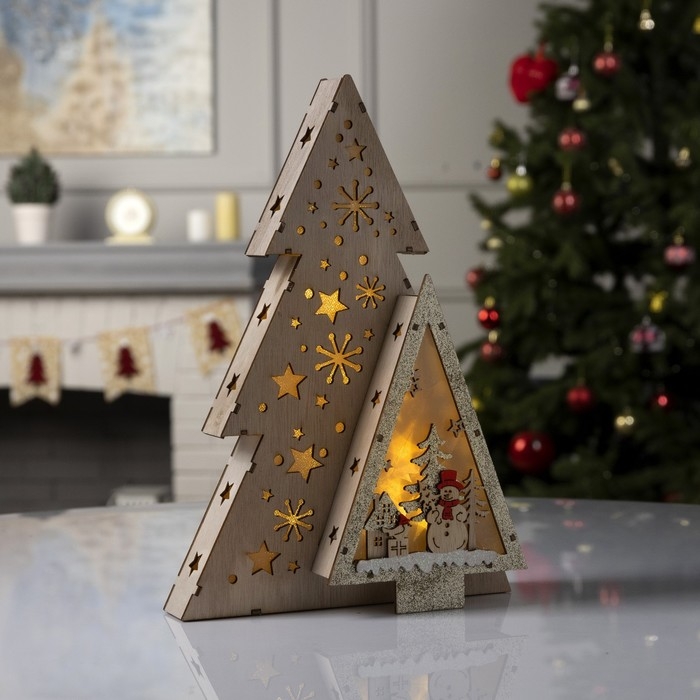Светодиодная фигура «Звёздная ель со снеговиком» 20 × 30 × 6.5 см, дерево, батарейки АААх2 (не в комплекте), свечение тёплое белое