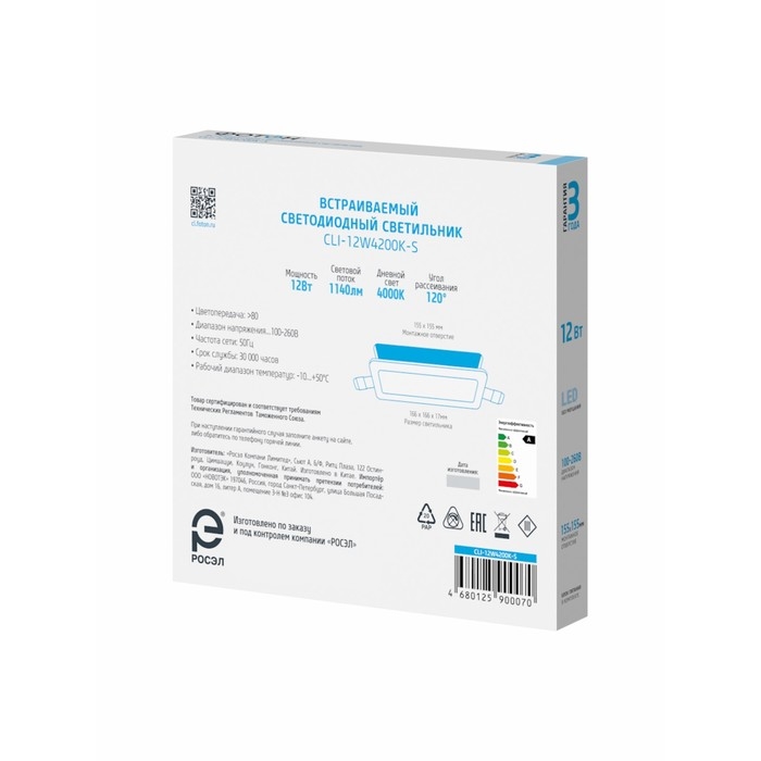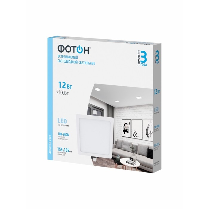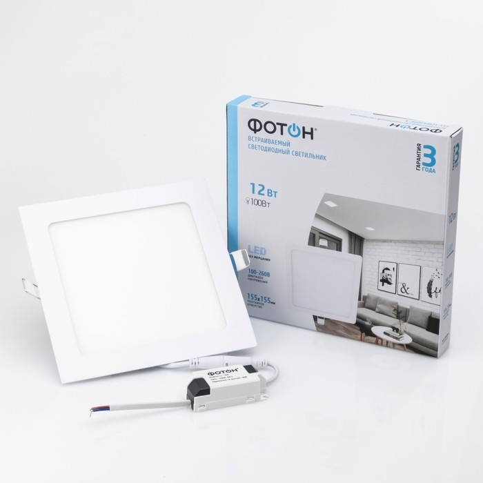 Светодиодный встраиваемый светильник ФОТОН квадратный CLI-12W4200K-S предназначен для общего и акцентного освещения внутри жилых и административных помещений. Широкий диапазон рабочих напряжений. Стабильно ровный световой поток в напряжениях от 100 В до 260 В. Безопасен для зрения и здоровья благодаря низкому уровню пульсации светового потока (менее 5%) в течение всего срока службы. Ультратонкий дизайн. Встраиваемый светильник выполнен в узком корпусе и подходит для установки в помещениях с ограниченным потолочным пространством.