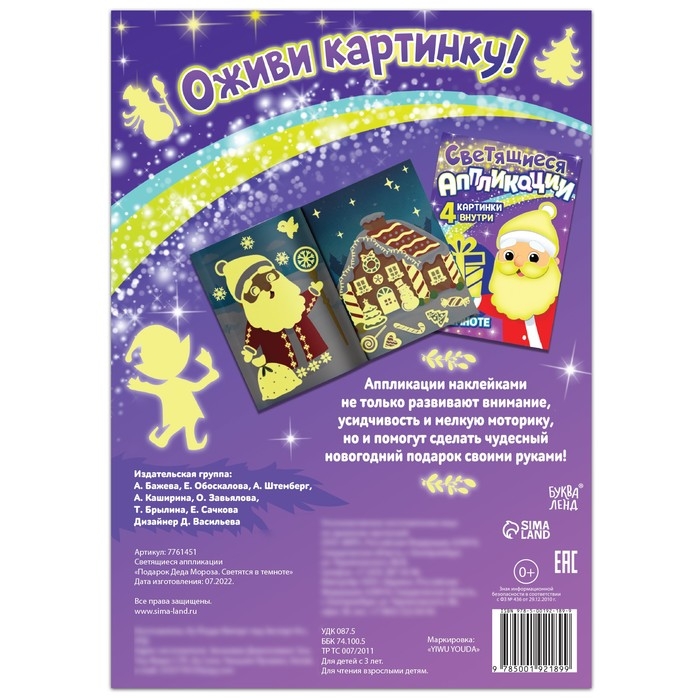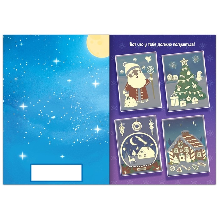 - Внутри ребёнок найдёт 4 заготовки для аппликаций, 4 странички со светящимися наклейками и примеры, что должно получиться в итоге.
