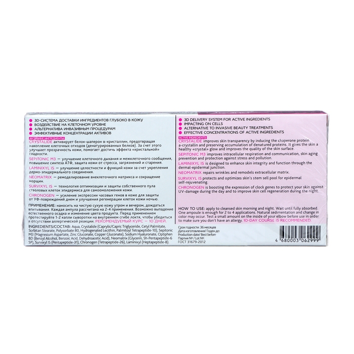 Способ применения: Наносить на чистую сухую кожу лица и шеи утром и вечером, дождаться впитывания. Затем нанести свой дневной или ночной крем. Каждая ампула рассчитана на 2-4 применения. Рекомендуемый курс — 10 дней.