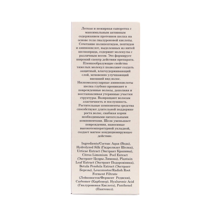 - Легкая, нежирная сыворотка с максимальным активным содержанием протеинов шелка на основе геля гиалуроновой кислоты.