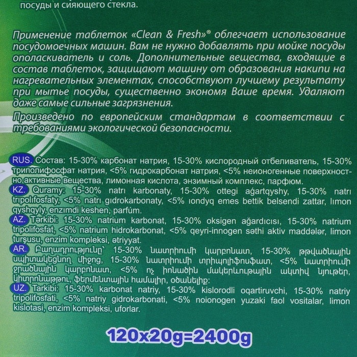 Таблетки для ПММ "Clean&Fresh", 120 шт - это эффективное средство для мытья посуды в посудомоечной машине. Они содержат все необходимые компоненты для качественного очищения посуды: моющее средство, соль для смягчения воды и ополаскиватель.