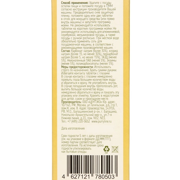 Способ применения: удалите с посуды остатки пищи и положите в пмм согласно инструкции производителя машины. Предварительно сняв защитную пленку, положите одну или две таблетки в отсек для моющего средства или прямо внутрь машины.