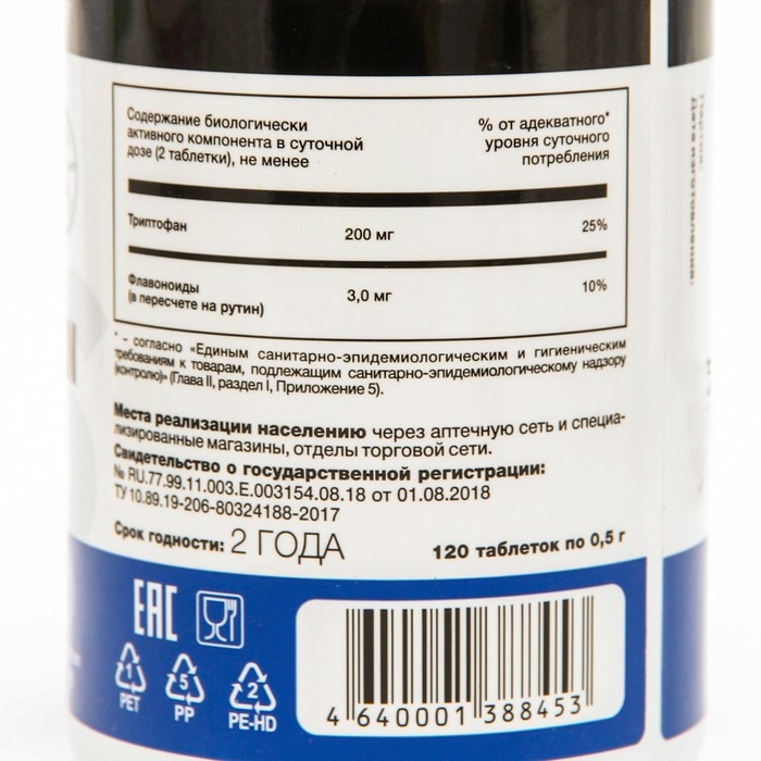 Состав: целлюлоза микрокристаллическая (носитель), L-триптофан, экстракт травы пустырника пятилопастного, экстракт корней валерианы лекарственной, экстракт семян гриффонии простолистной, экстракт плодов боярышника кроваво-красного, экстракт травы душицы обыкновенной, экстракт травы мяты перечной, крахмал картофельный, тальк молотый (антислёживающий агент).