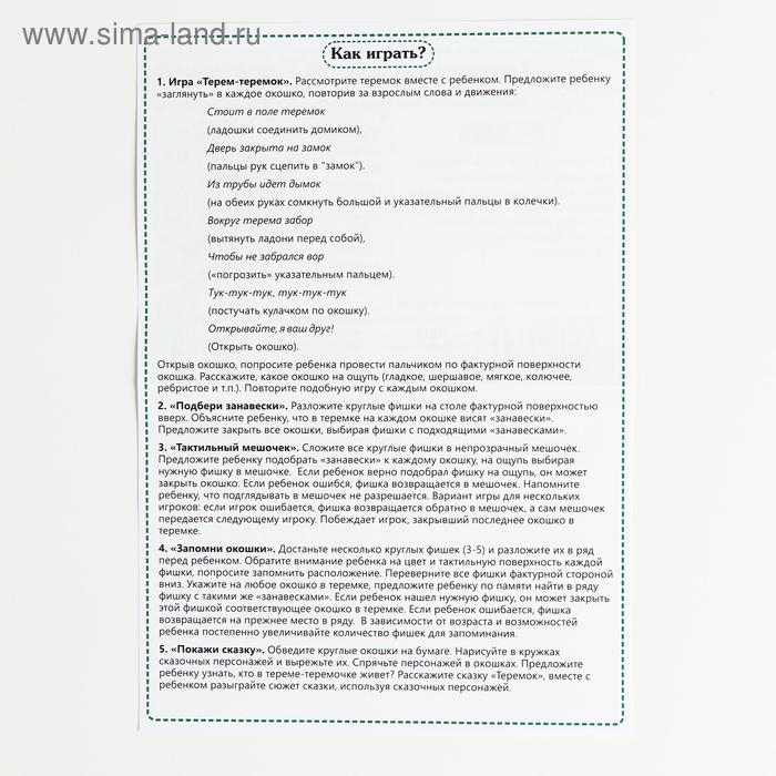 - Рассмотрите теремок вместе с ребёнком. Открыв окошко, попросите кроху провести пальчиком по фактурной поверхности окошка. Расскажите, какое окошко на ощупь (гладкое, шершавое, мягкое, колючее, ребристое и т.п.).