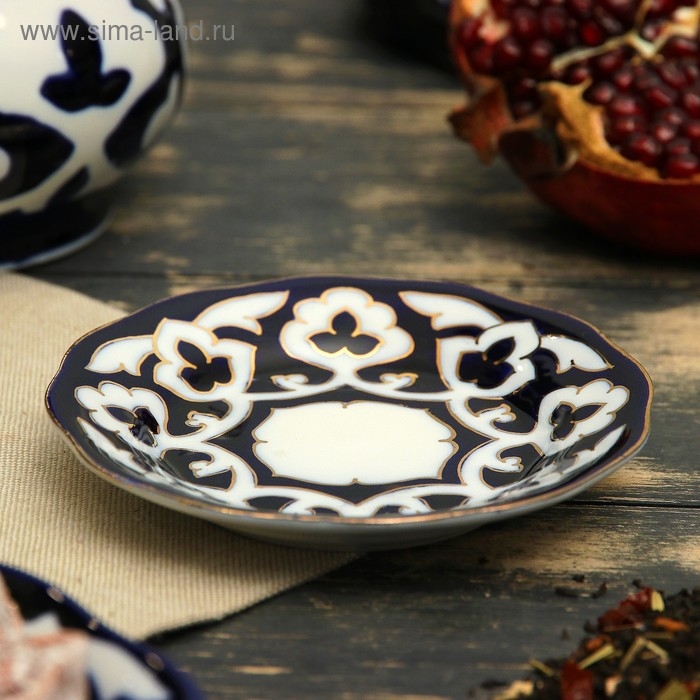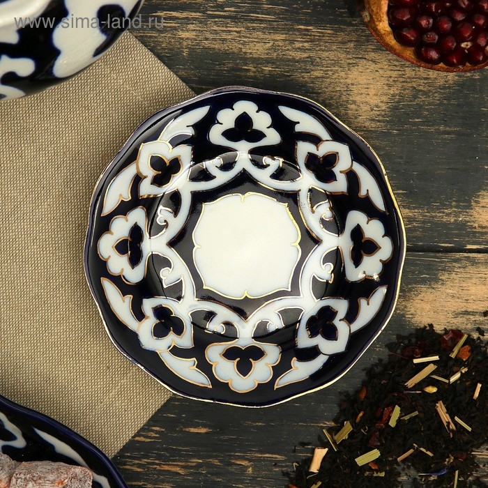 Национальная узбекская роспись «Пахта» сдержанна и благородна. Витиеватые узоры выводятся тонкой кистью, фон заливается тёмно-синим кобальтом. Контур изображений очерчен золотой каймой, придающей изделию блеск и роскошь. Густая глазурь наносится толстым слоем, благодаря чему рисунок мерцает.