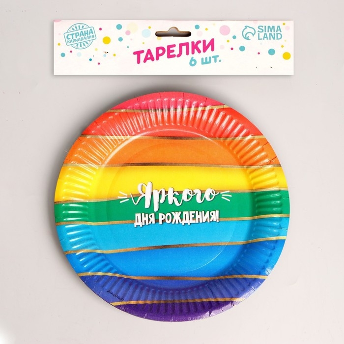 Тарелка одноразовая бумажная "Яркого дня рождения", набор 6 шт, 18 см