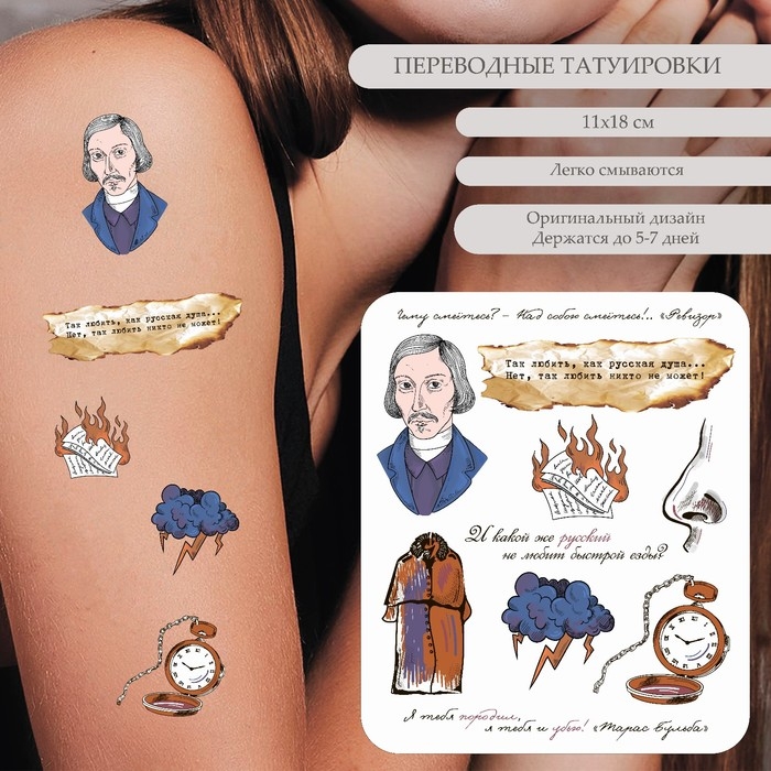 Татуировка на тело цветная "Н.В. Гоголь - Чему смеётесь?" 18х11 см