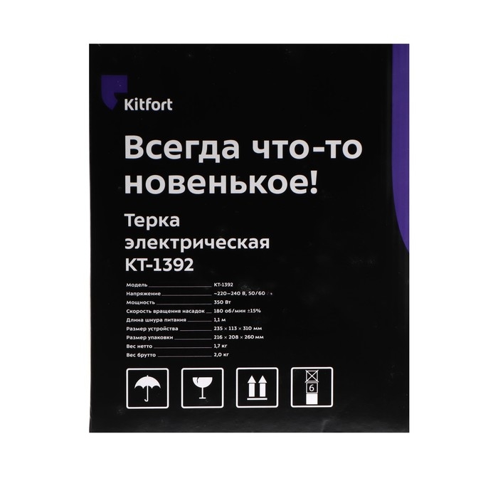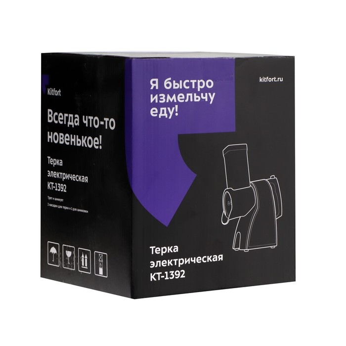 Тёрка Kitfort КТ-1392, электрическая, 3 насадки, 350 Вт, 180 об/мин, чёрно-серебристая