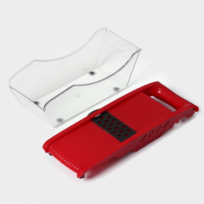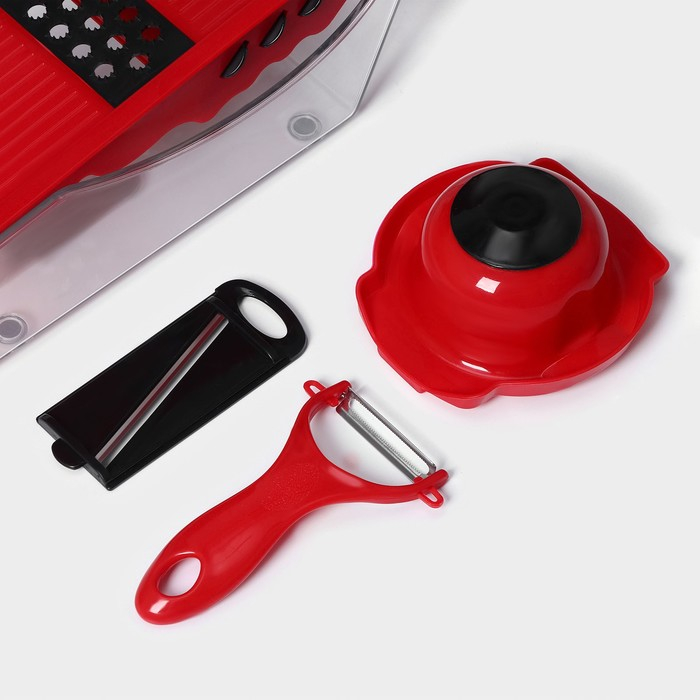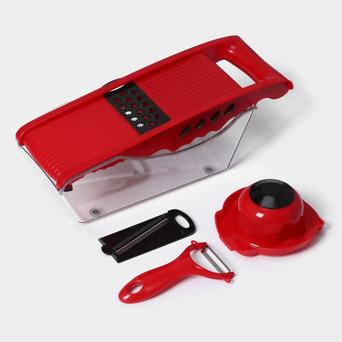 Тёрка с лотком Доляна Vegan, 6 насадок, 30×10,5×11 см, цвет зелёный, овощечистка металлическая, цвет красный