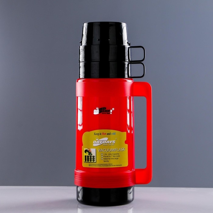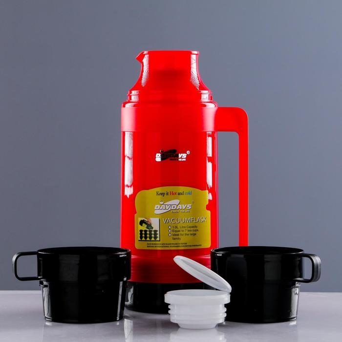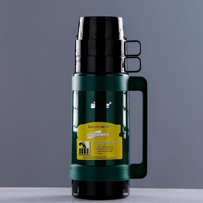 Термос 1 л, со стеклянной колбой, 2 кружки, 13.5 х 32 см, микс