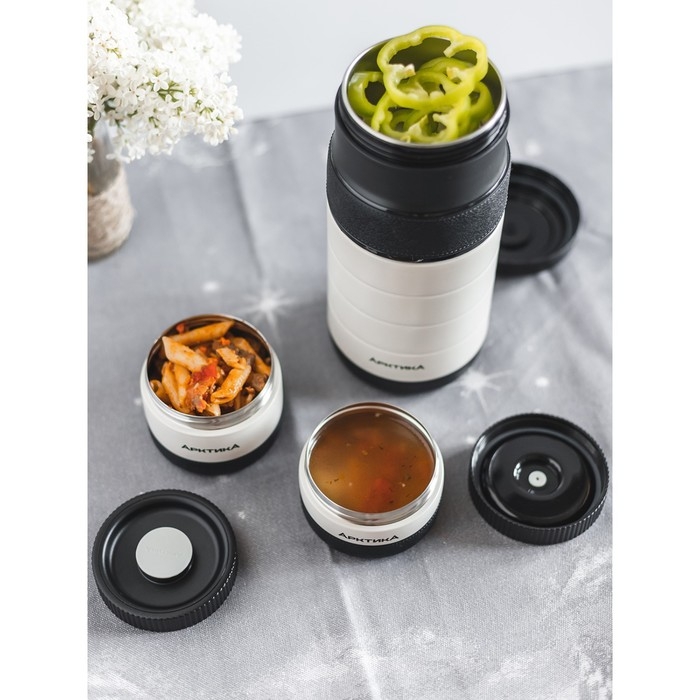 308-1300 термос для еды с металлическими контейнерами позволит одновременно перевозить 3 блюда. Внутри термоса есть два контейнера на 400 и 300 мл, можно использовать как термос для супа / термос для каши и других вторых блюд, а в крышке - дополнительная емкость объемом 300 мл для продуктов, не требующих сохранения тепла, например, для салата. Обращаем ваше внимание, что термос можно использовать только вместе с контейнерами. Отдельно контейнеры держать тепло и холод не будут. Благодаря диаметру горлу удобно есть прямо из него, а после - легко мыть. 308-1300 термос с кнопкой от присасывания поможет открыть его без лишних усилий. Накладки на углах контейнеров предохраняют колбу от царапин, а прорезиненная крышка помогает их легко открыть. Арктика термос для еды с контейнерами выполнен из долговечной нержавеющей стали и безопасного пищевого пластика, которые не влияют на вкусовые качества еды. Подходит для детей и детского питания.