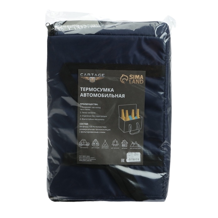Термосумка Cartage тёмно-синего цвета — идеальный вариант для хранения и транспортировки продуктов питания и напитков. Её объём составляет 30 литров, что позволяет вместить достаточное количество еды для большой компании.