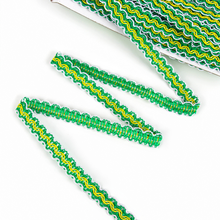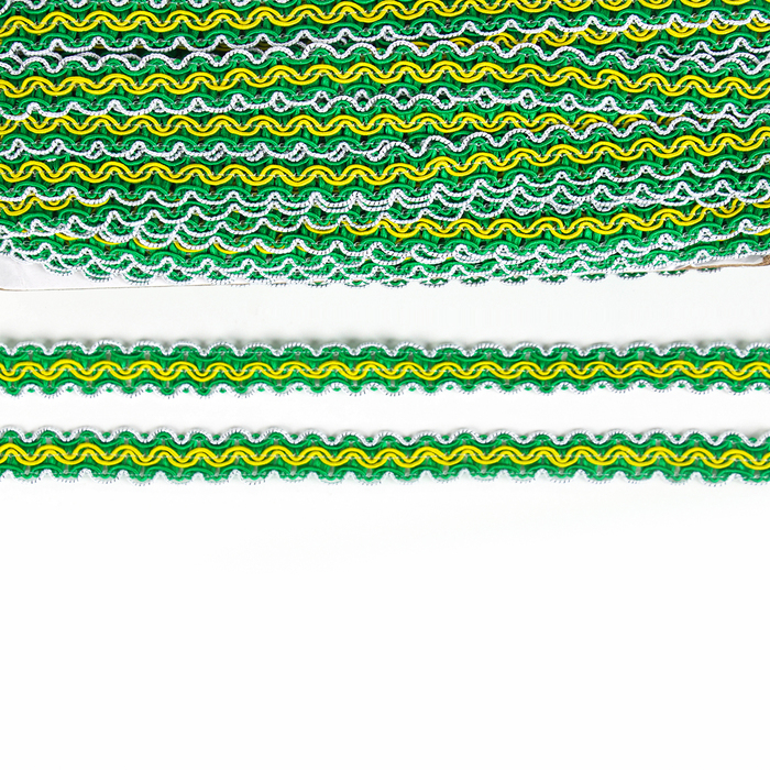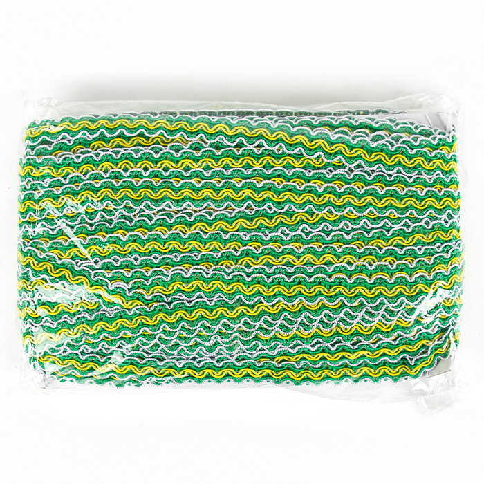 Тесьма бело-зелёно-желтая, ширина 1,2 см, в упаковке 50 м