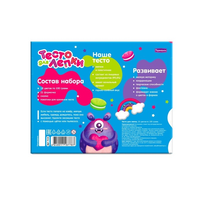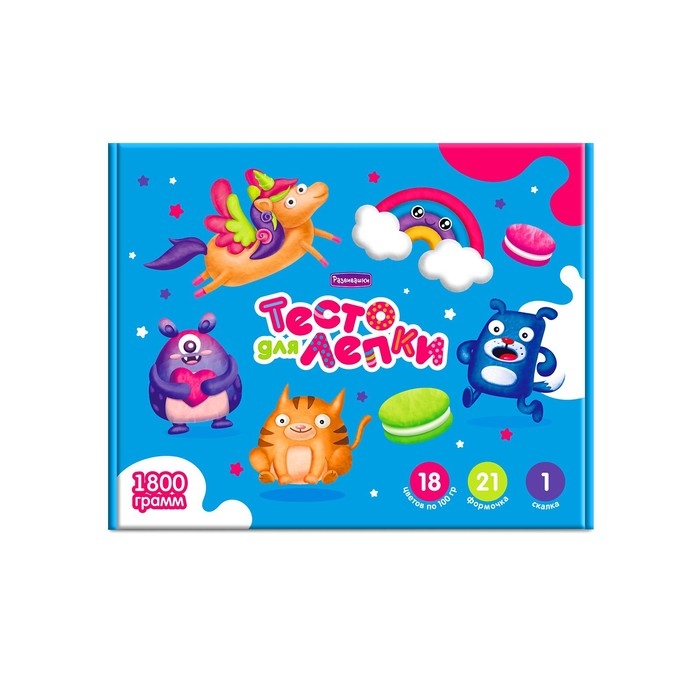 Тесто для лепки в коробке, тесто 1800 г, 18 цветов, 21форма, скалка