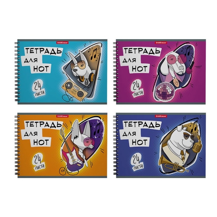 Тетрадь для нот А5, 24 листа на спирали, ErichKrause POP-Dogs, горизонтальная ориентация, пластиковая обложка, блок офсет 100% белизна, МИКС