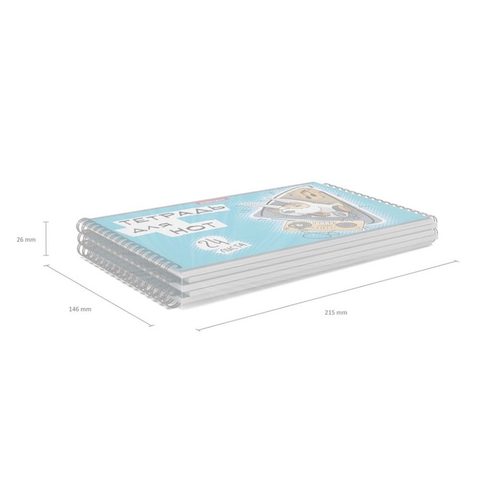 Тетрадь для нот формата А5 (146x200 мм). Ориентация - горизонтальная. Обложка из высококачественного мелованного картона плотностью 190 г/м2. В блоке 24 листа. Бумага офсетная плотностью 80 г/м2. Цвет линовки - черный. Тип скрепления - скоба. Имеет справочный материал и вспомогательные линии нотного стана. Тетради одного дизайна упакованы в термоусадочную пленку по 10 штук. Товар поставляется в нескольких вариантах дизайна без возможности выбора.