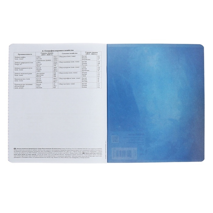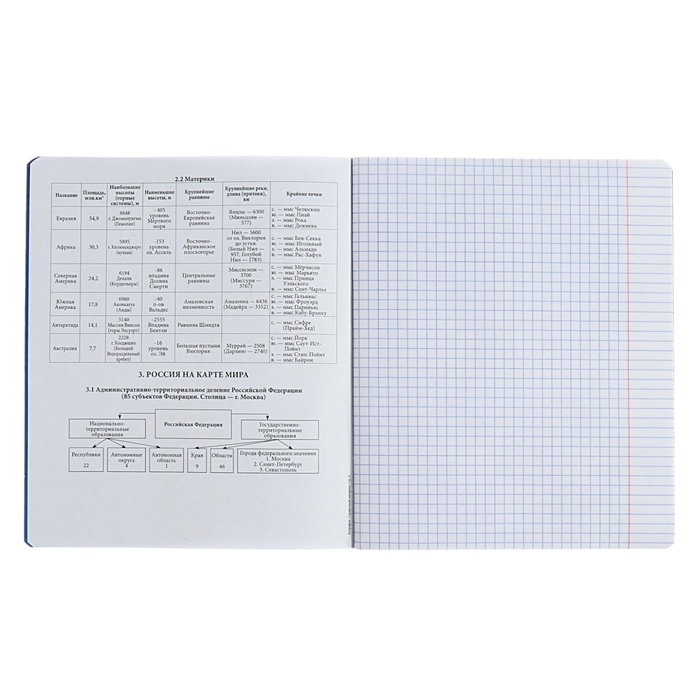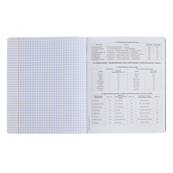 Тетрадь предметная формата А5+ (170х203 мм). Обложка из высококачественного мелованного картона плотностью 190 г/м2. Отделка - твин-лак. В блоке 48 листов в клетку с полями. Бумага офсетная плотностью 60 г/м2. Белизна бумаги - 100%. Цвет линовки - синий. Скругленные уголки обложки и блока. Тип скрепления - скоба. Имеет дополнительный лист с инфо-блоком с кратким изложением школьной программы. Тетради упакованы в термоусадочную плёнку по 5 штук.
