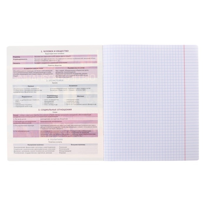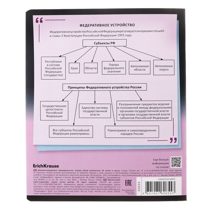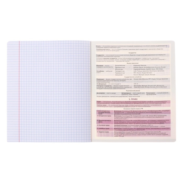 Тетрадь предметная формата А5+ (170х203 мм). Обложка из высококачественного мелованного картона плотностью 170 г/м2. В блоке 36 листов в клетку с полями. Бумага офсетная плотностью 60 г/м2. Белизна бумаги - 100%. Цвет линовки - синий. Скругленные уголки обложки и блока. Тип скрепления - скоба. Имеет инфо-блок с кратким изложением школьной программы. Тетради упакованы в термоусадочную плёнку по 5 штук.