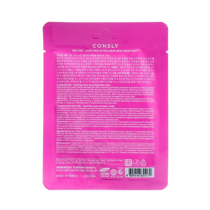 Тканевая маска для детоксикации кожи лица Consly «После читмила», 23 мл