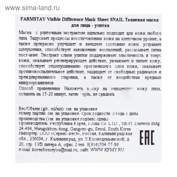 Восстанавливающая тканевая маска для лица оказывает активное увлажняющее, тонизирующее, успокаивающее и разглаживающее действие. Муцин улитки содержит коллаген, протеины, аллантоин и эластин, которые помогают коже восполнить недостаток влаги и исключают главную причину увядания, разглаживает микрорельеф, интенсивно питает и глубоко увлажняет, успокаивает чувствительную и раздраженную кожу, обладает превосходными отбеливающими свойствами, стимулирует процесс регенерации и заживления.