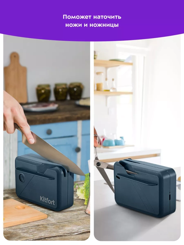 Электроточилка для ножей Kitfort КТ-6815 поможет быстро и безопасно заточить ножи с гладкими стальными лезвиями, керамические ножи, а также ножницы.